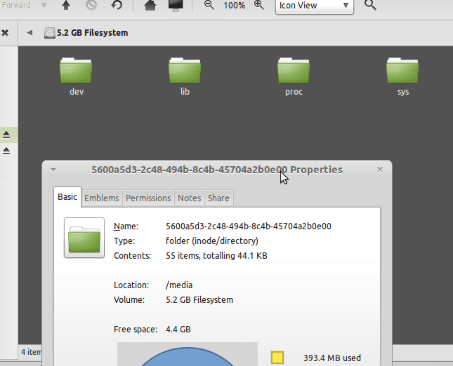看来系统是启动不了了,然后我用mint debian的live cd启动,挂在了原系统的磁盘,看到只剩下dev、lib、proc、sys,这四个目录了然后运行了dev下面有46个文件,都是诸如“null”,“shm”之类的,lib下面只剩下./lib/init/rw/sendsigs.omit.d:rsyslog,而另两个文件夹是空的,而且所有的文件只有44kb,如图: