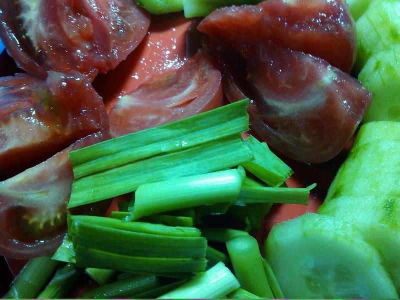 先打多半锅水,放在火上烧着,去摘菜。将菜洗净,西红柿切块,蒜苗切段,黄瓜刮皮后切片放好。
